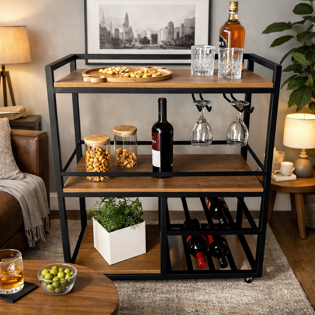 Carrinho aparador e adega com estrutura em ferro reforçado e tampo em MDF Freijó. Ideal para salas de jantar, áreas gourmet e ambientes modernos. Possui rodas que garantem fácil movimentação. Perfeito para armazenar bebidas, taças e objetos decorativos. Produção própria artesanal.